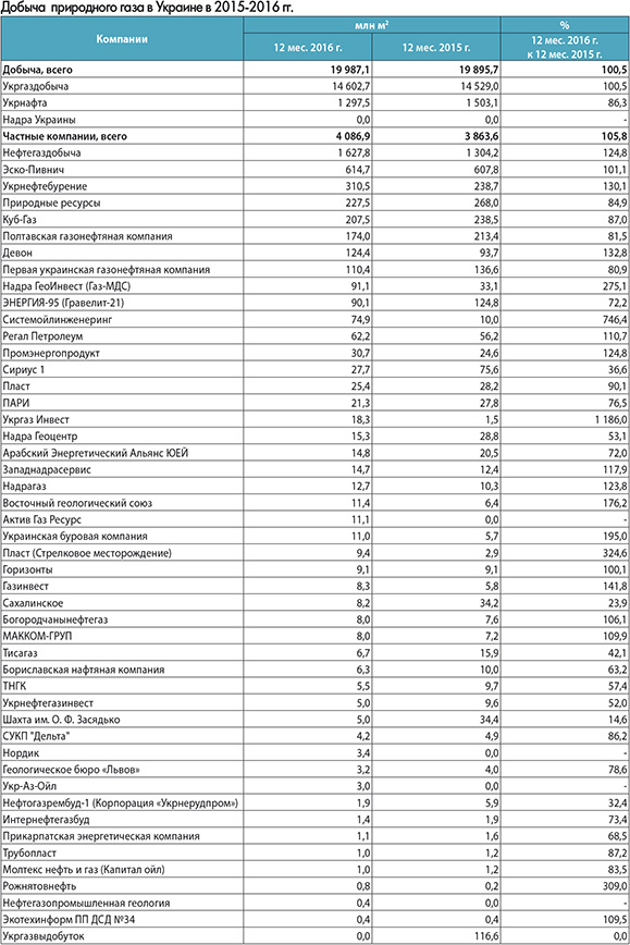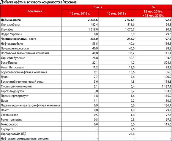 У 2016 році сумарний видобуток нафти і конденсату іншої найбільшої видобувної компанії - «Укрнафти» - скоротилася на 9,2% (при очікуваних 15%), до 1,5 млн т, газу - на 13,4%, до 1,3 млрд куб.м (більш детально про це в НР №7 від 20.02.2017).